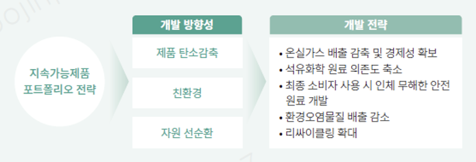 제품 포트폴리오 다각화 및 친환경 시장 트렌드와 기후변화에 적극 대응하고자 ‘제품 탄소감축’, ‘친환경’, ‘자원 선순환’을 3대 개발 방향으로, 지속가능 제품 개발 전략을 수립하였습니다.